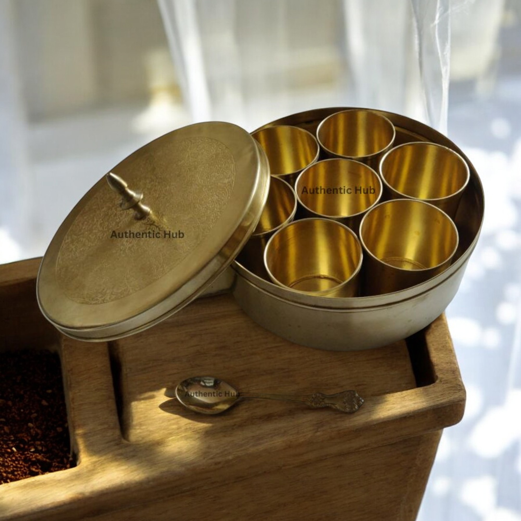 Discover the beauty of tradition with this Indian Handcrafted Round Spice Box. Made from premium brass, this masala dabba features intricate designs that celebrate the rich heritage of Indian spices. Perfect for storing your masalas and spices, this brass masala box keeps them fresh and organized in style. The Indi Authentic Hub offers this exquisite spice container, ideal as a housewarming gift or for enhancing your own kitchen. This masala box for the kitchen ships worldwide within 7 days, making it easy to buy spice box online and add a touch of India to your home.